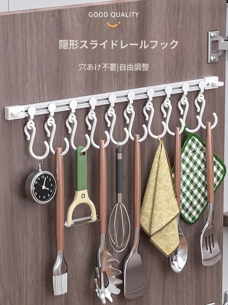 キッチンの収納革命!ドア裏に簡単取り付け、穴あけ不要のスライドトラックフック。便利なシリコン製スパチュラや調理器具をすっきり整理!キッチンをもっとスッキリ、使いやすく!