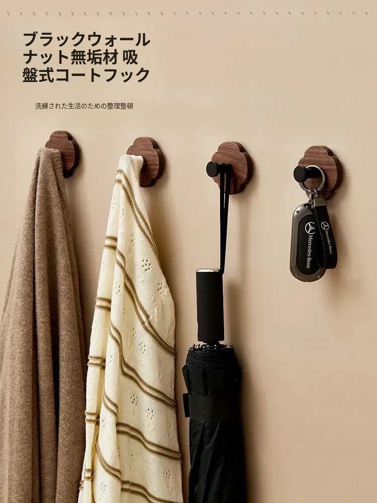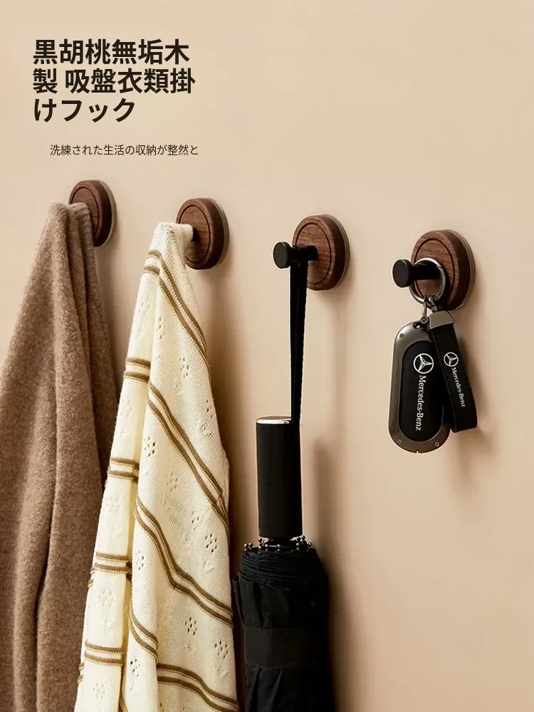 木町の天然木製吸盤フック - 穴を開けずに取り付け可能!重さに強い無痕バスルーム用フック、和風のウォールナットデザインでおしゃれな空間を演出!