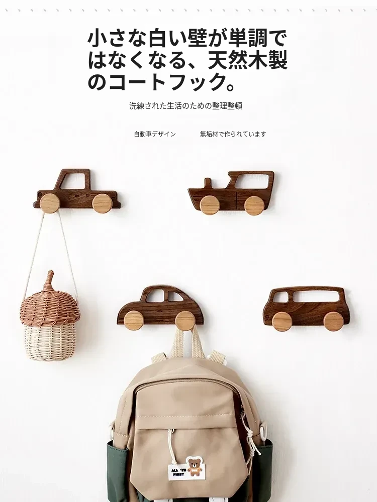 かわいいデザインの木製ハンガー!子供部屋や玄関にぴったりのカートゥーンスタイル。壁に穴を開けずに簡単取り付け!おしゃれで実用的な衣類収納を実現します。