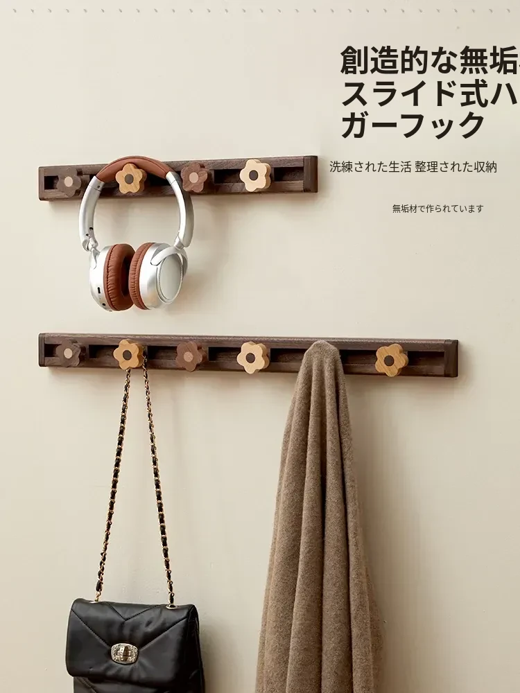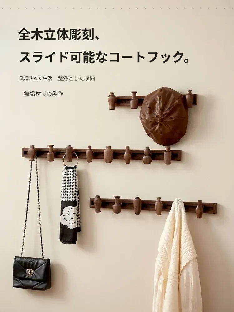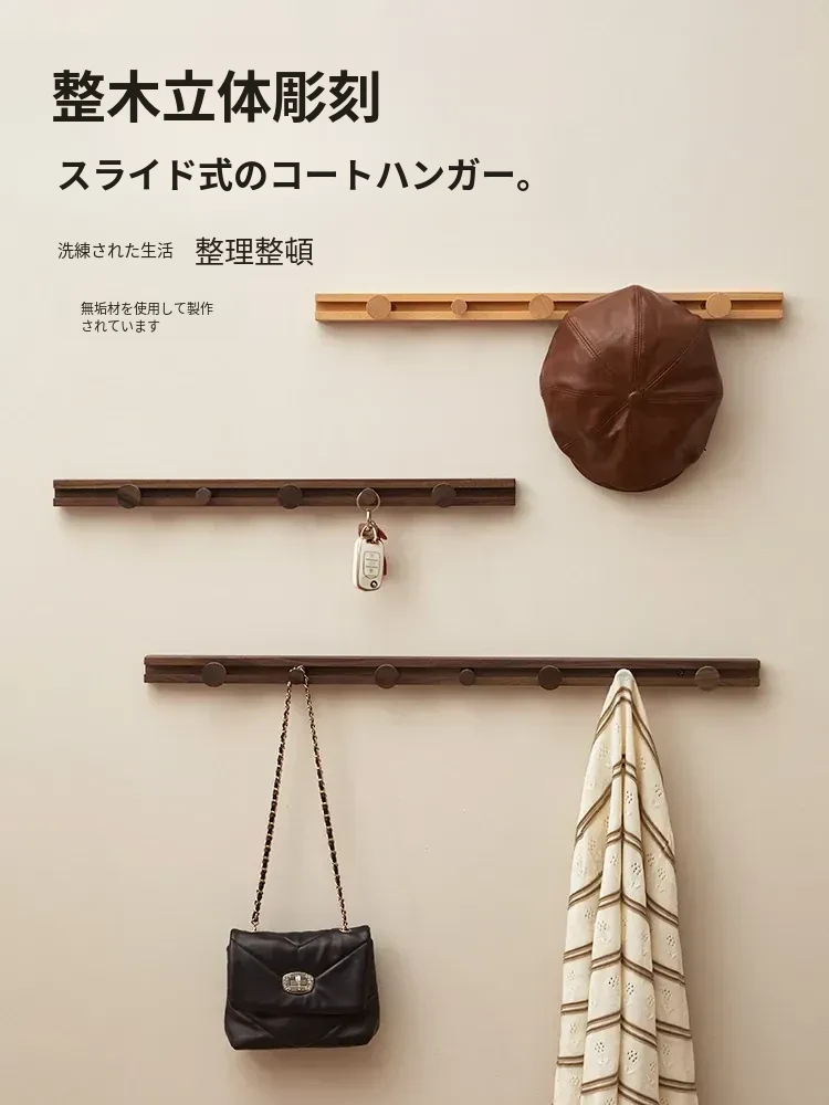 壁掛けフック - ノーネイル設計で簡単取り付け!スライド式の木製コートハンガーで、洗練された玄関を演出。おしゃれな収納で、帽子やコートをスマートに整理整頓!