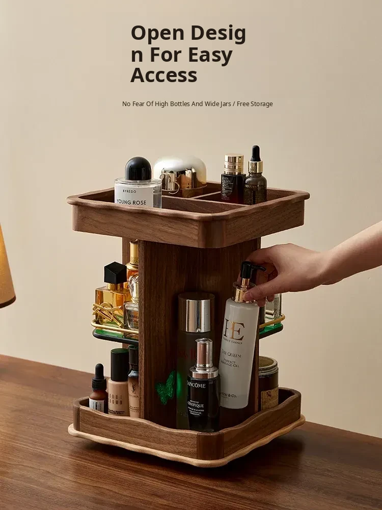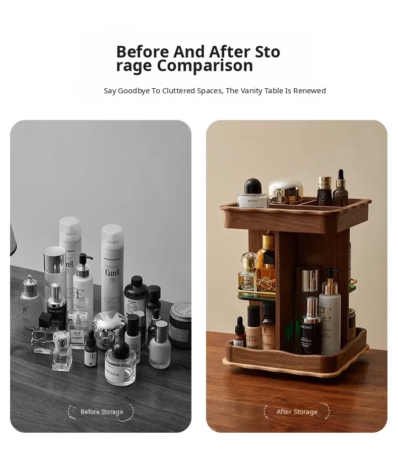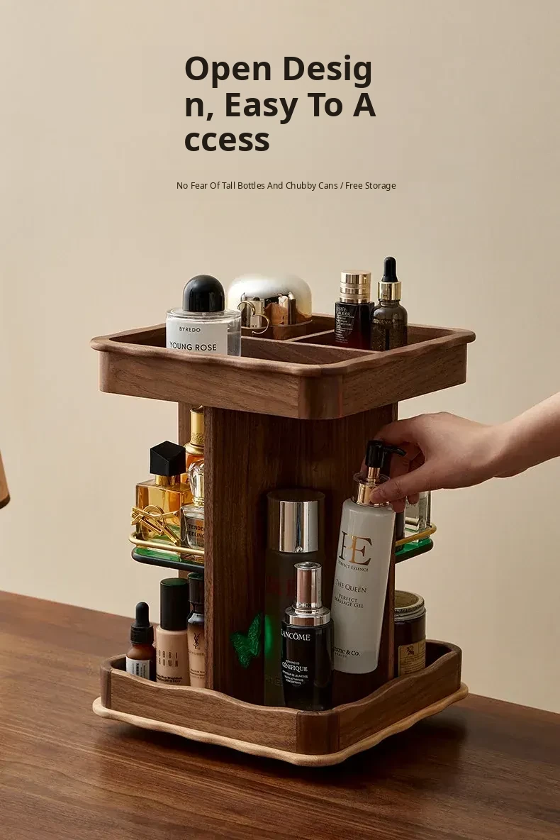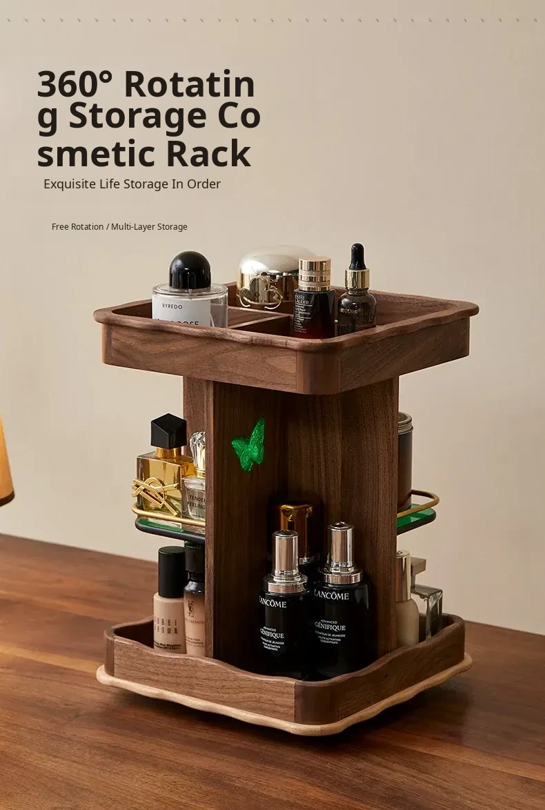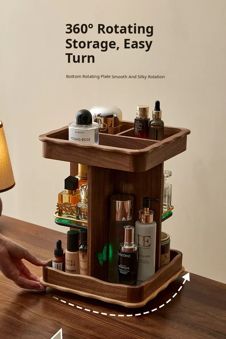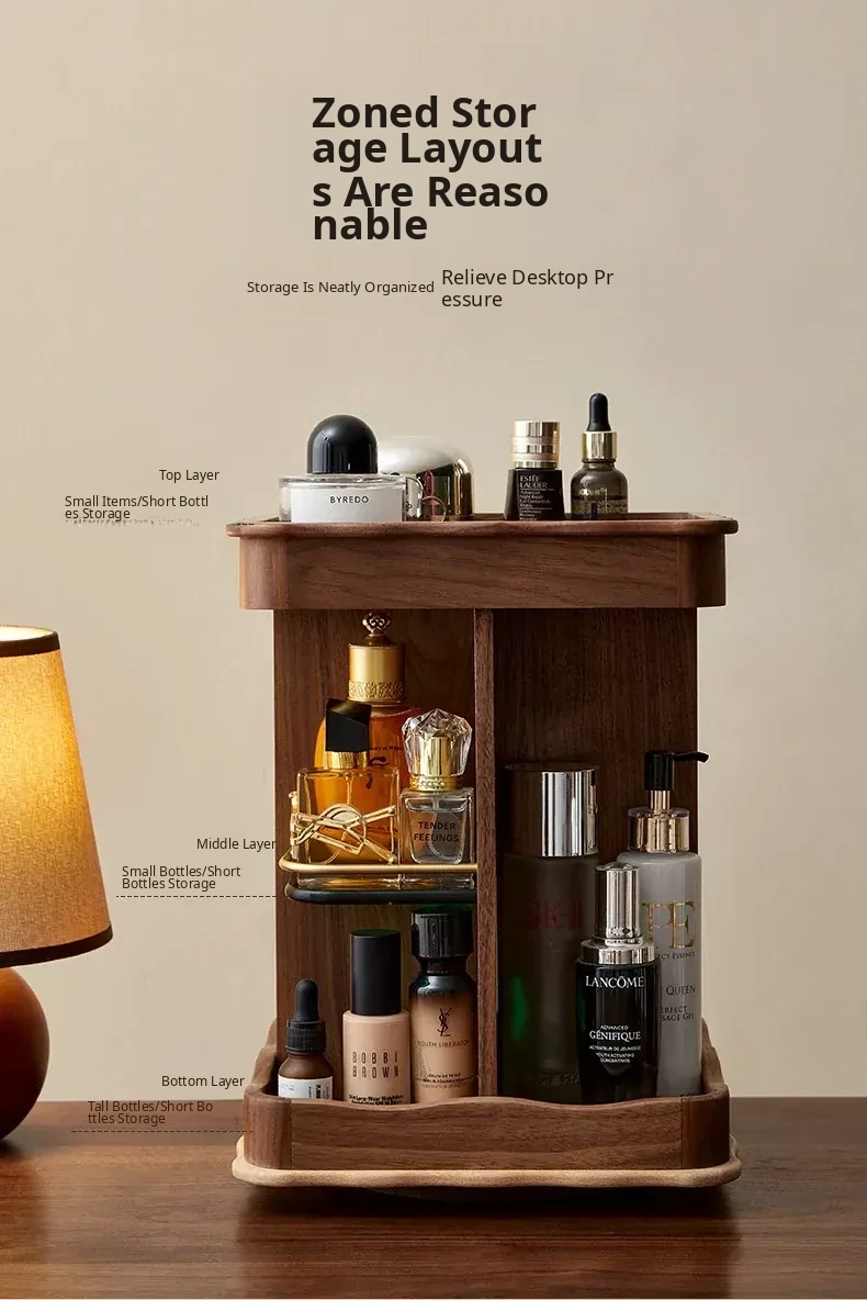 Elegant Solid Wood Rotating Makeup and Jewelry Organizer - Large Capacity Desktop Storage for Vanity and Skincare Products