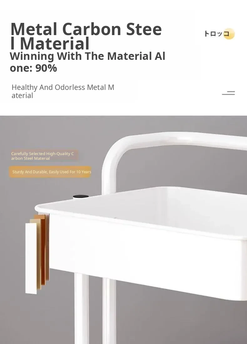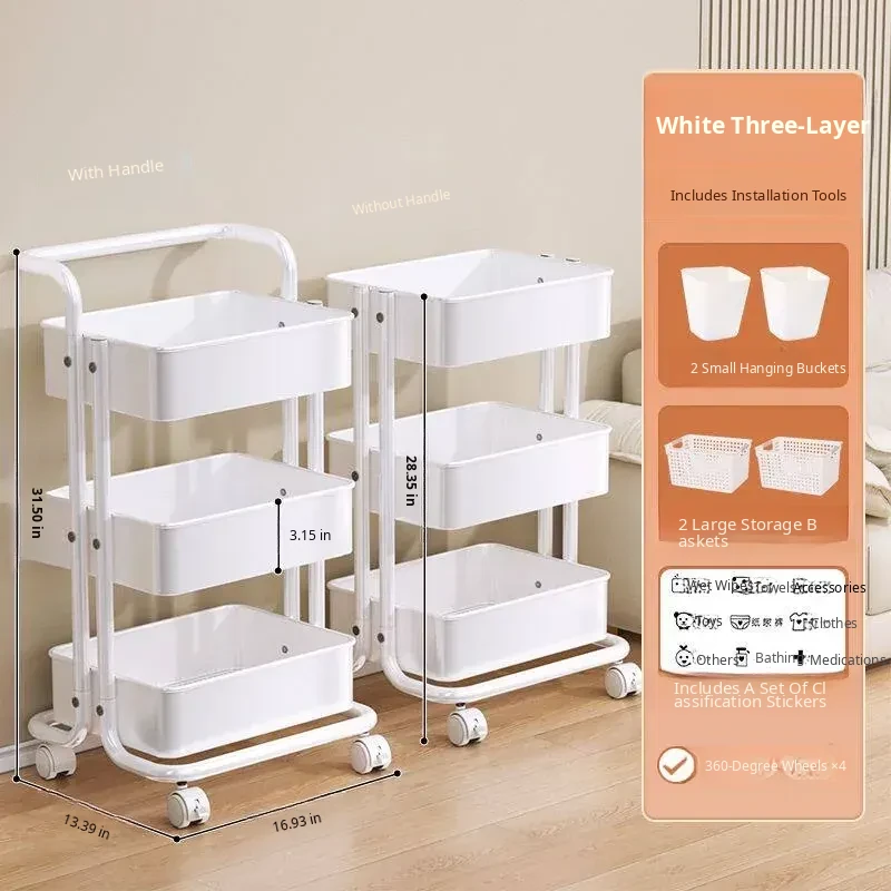 White with Handle - 2 Baskets, 2 Buckets, 1 Sticker Layer Spacing 11.02in-4 Bottom Tubes, 157.48 iniddle Poles, 3 Storage Baskets, 4 Universal Wheels