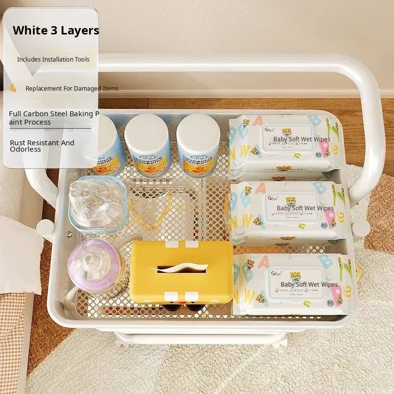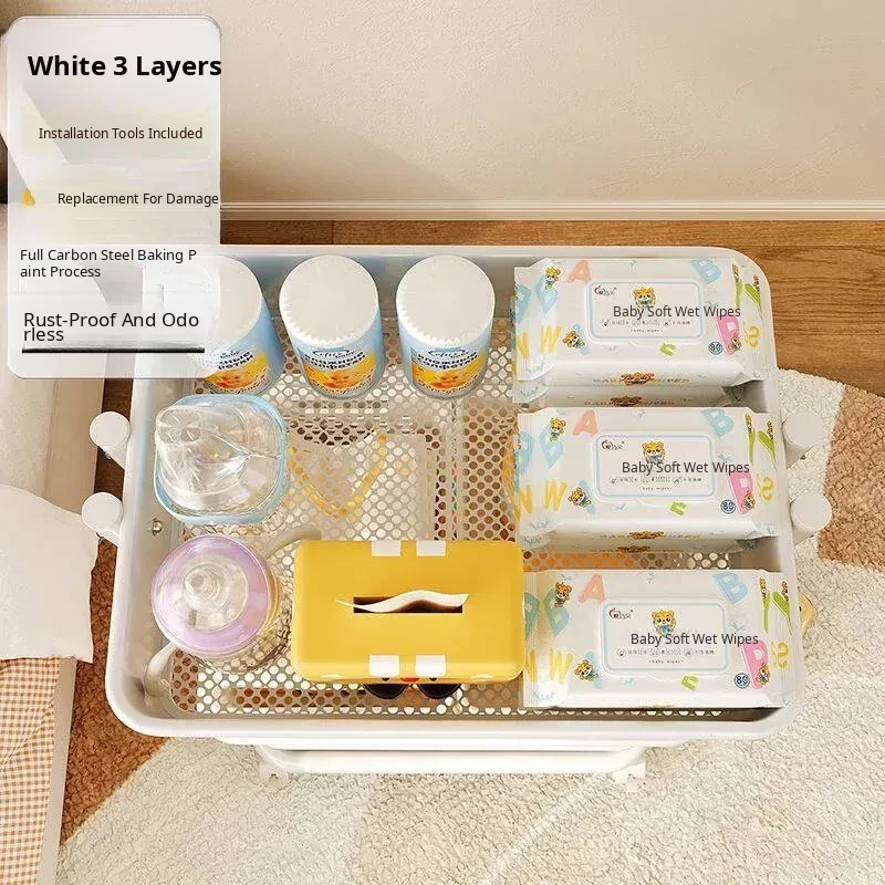 White Without Railing - Bottom Width 13.78in Layer Spacing 11.02in-4 Bottom Tubes, 157.48 iniddle Poles, 3 Storage Baskets, 4 Universal Wheels