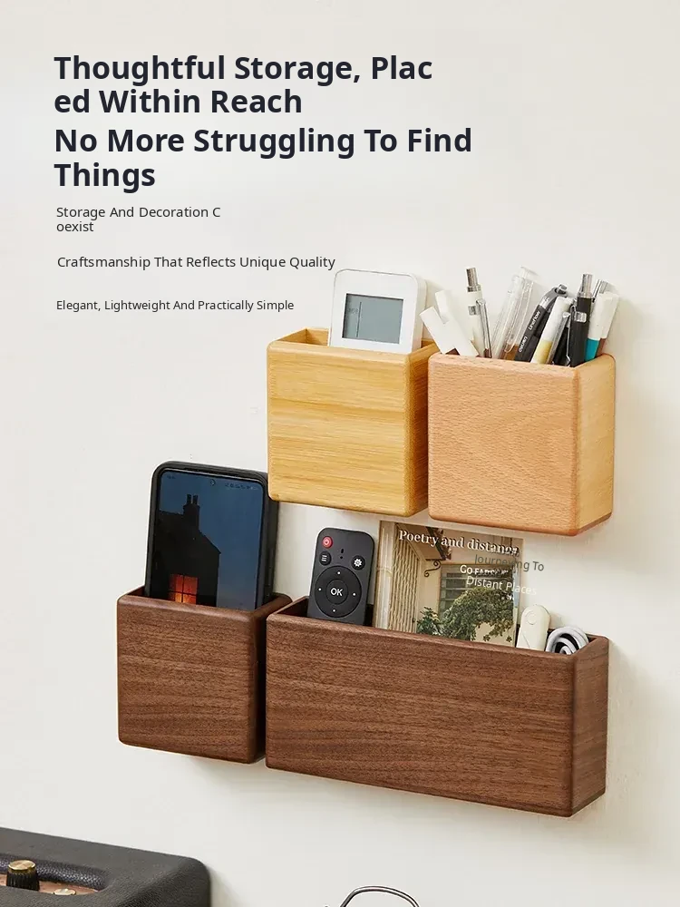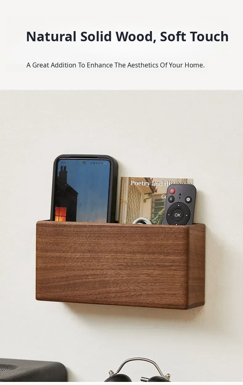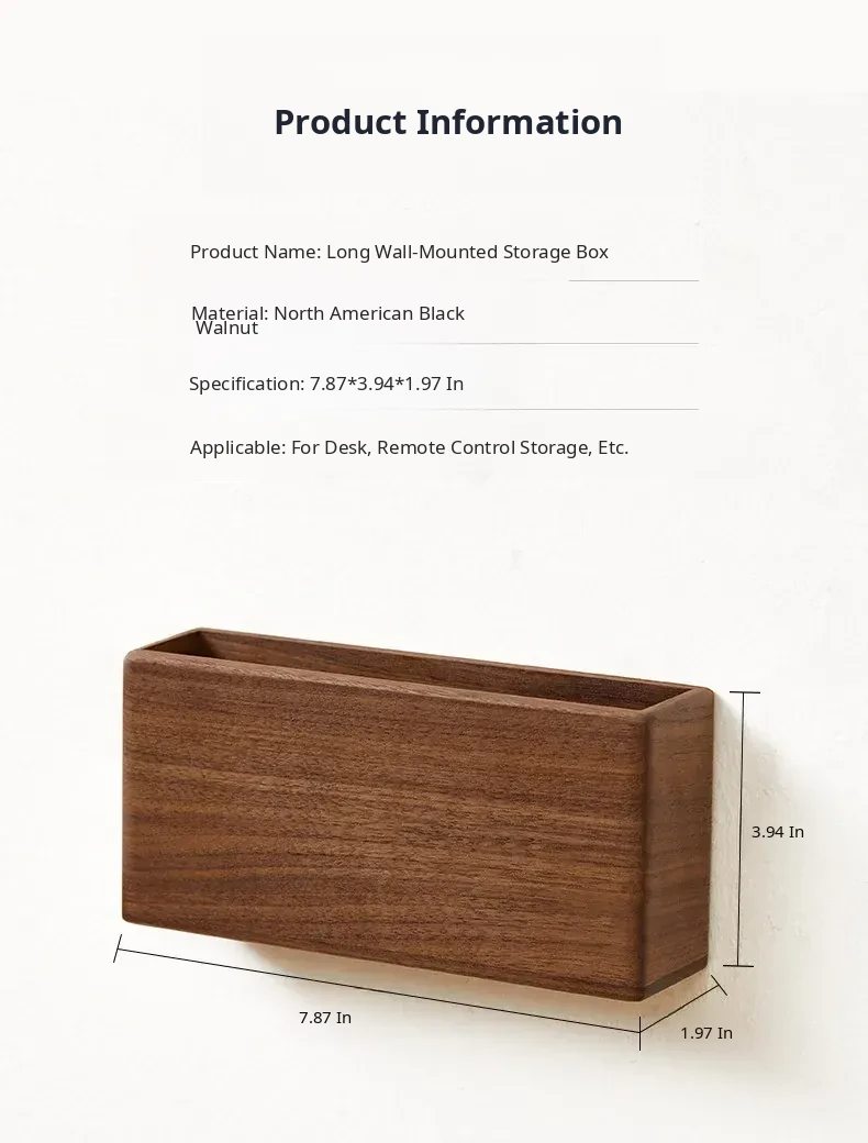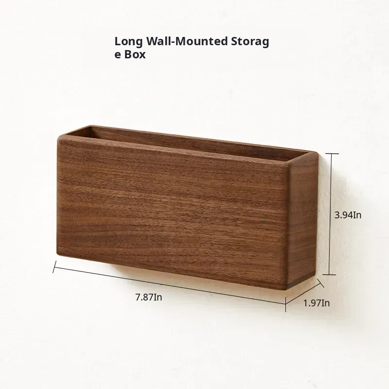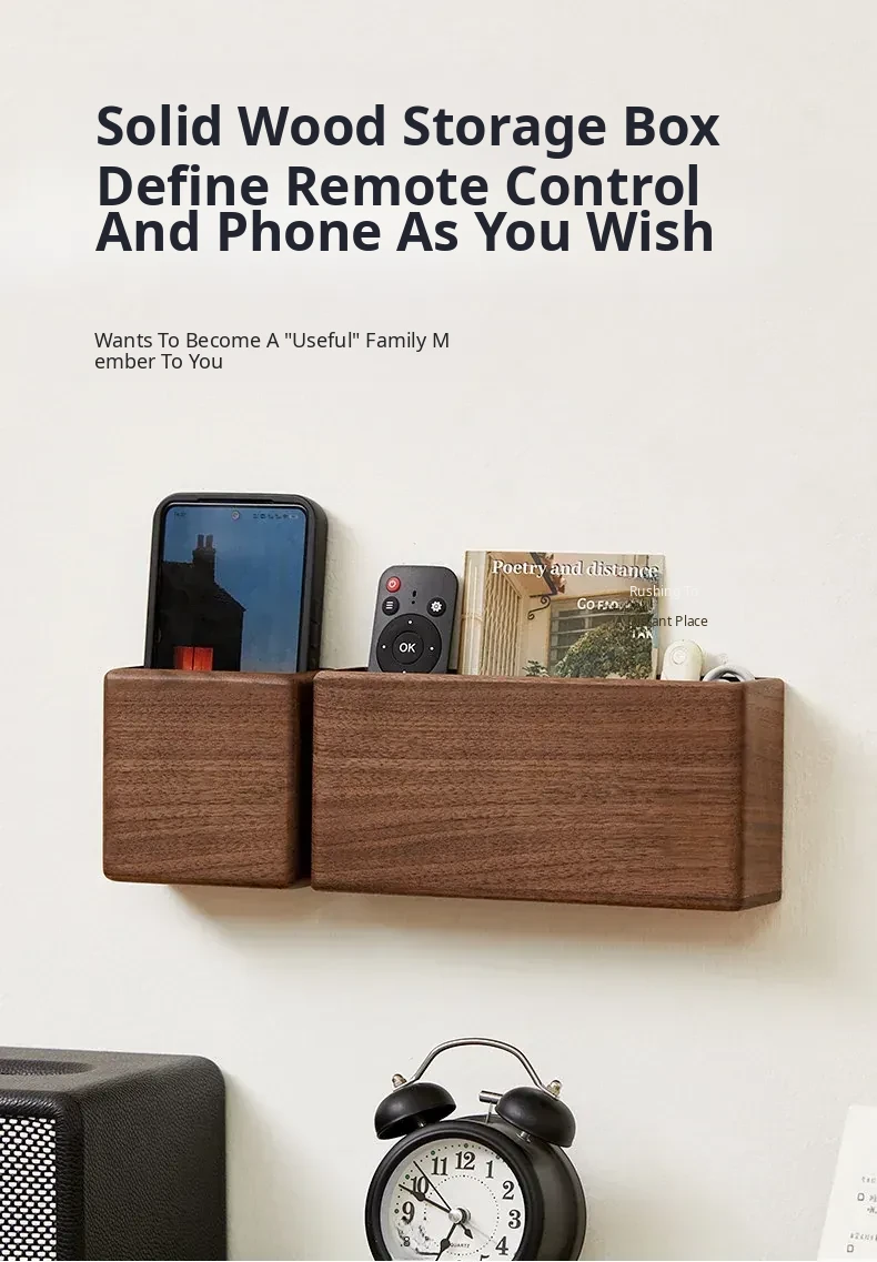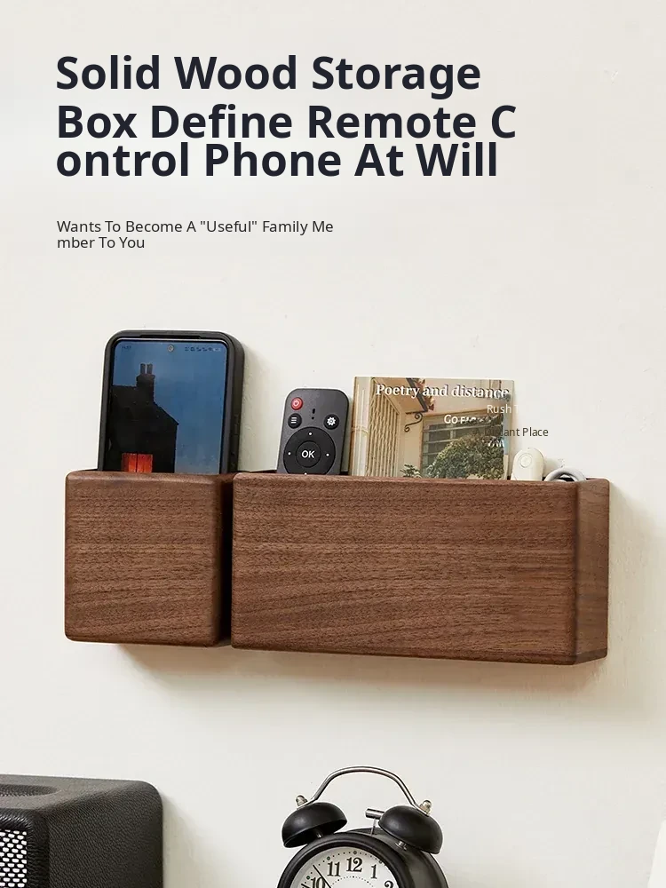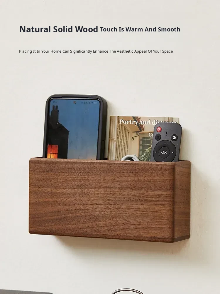 Wall-Mounted Solid Wood Remote Control Storage Box - No Drilling Required, Stylish Black Walnut Organizer for Air Conditioners and Phones