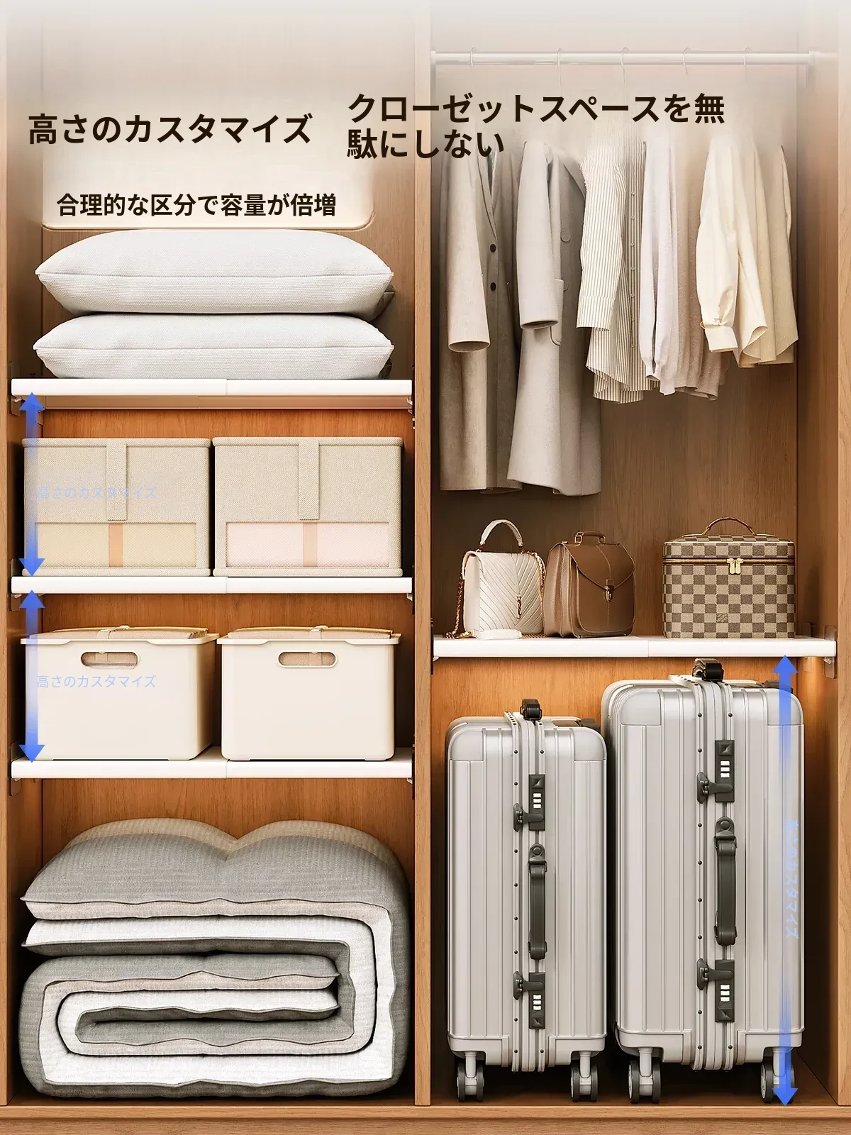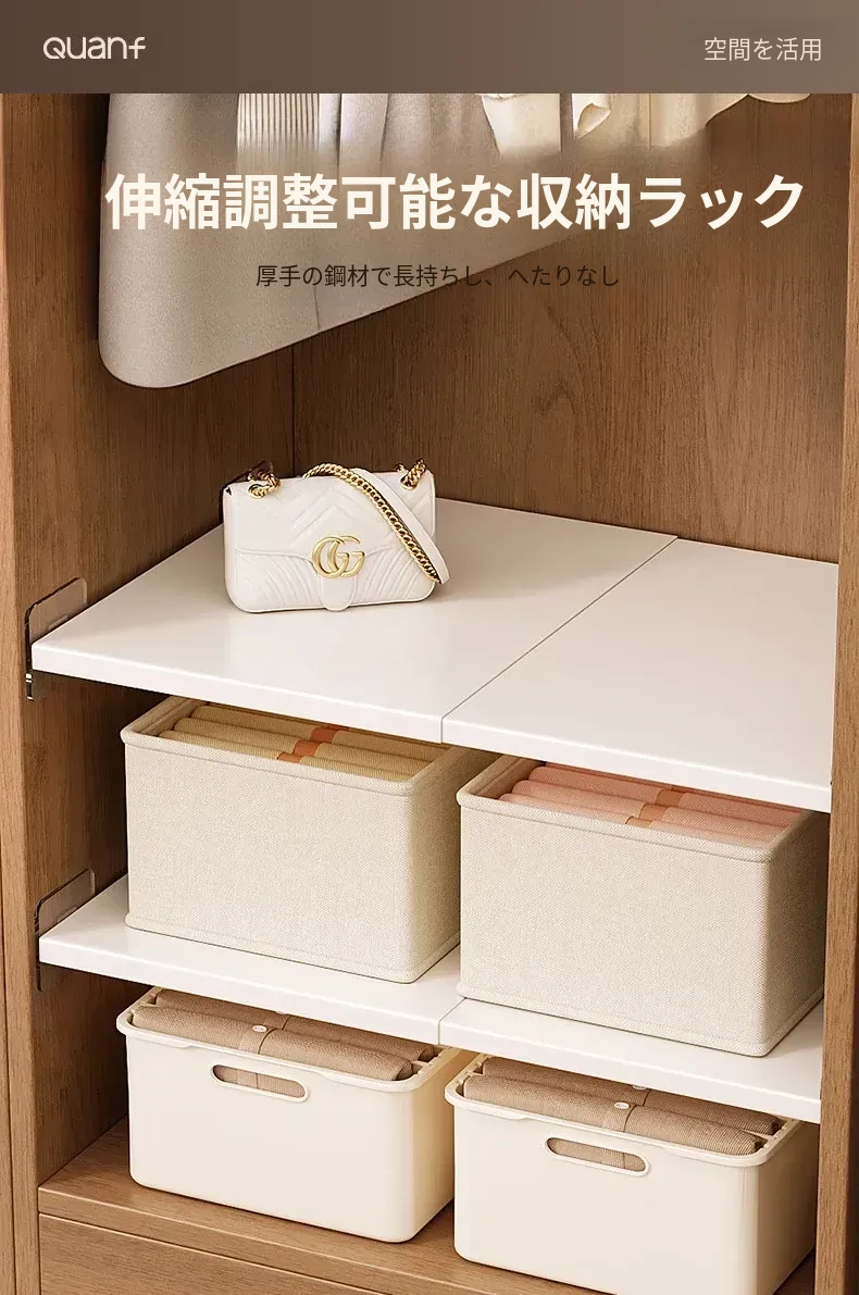 衣類収納の革命!伸縮式の分層棚でクローゼットをスマートに整理!ネジ不要の多層収納ラックで、スペースを有効活用。おしゃれで機能的、あなたの衣類をすっきり収納!
