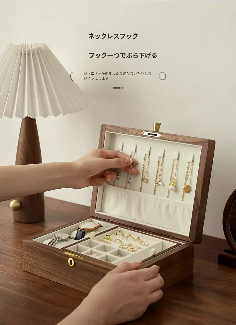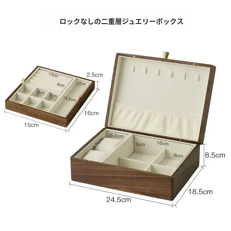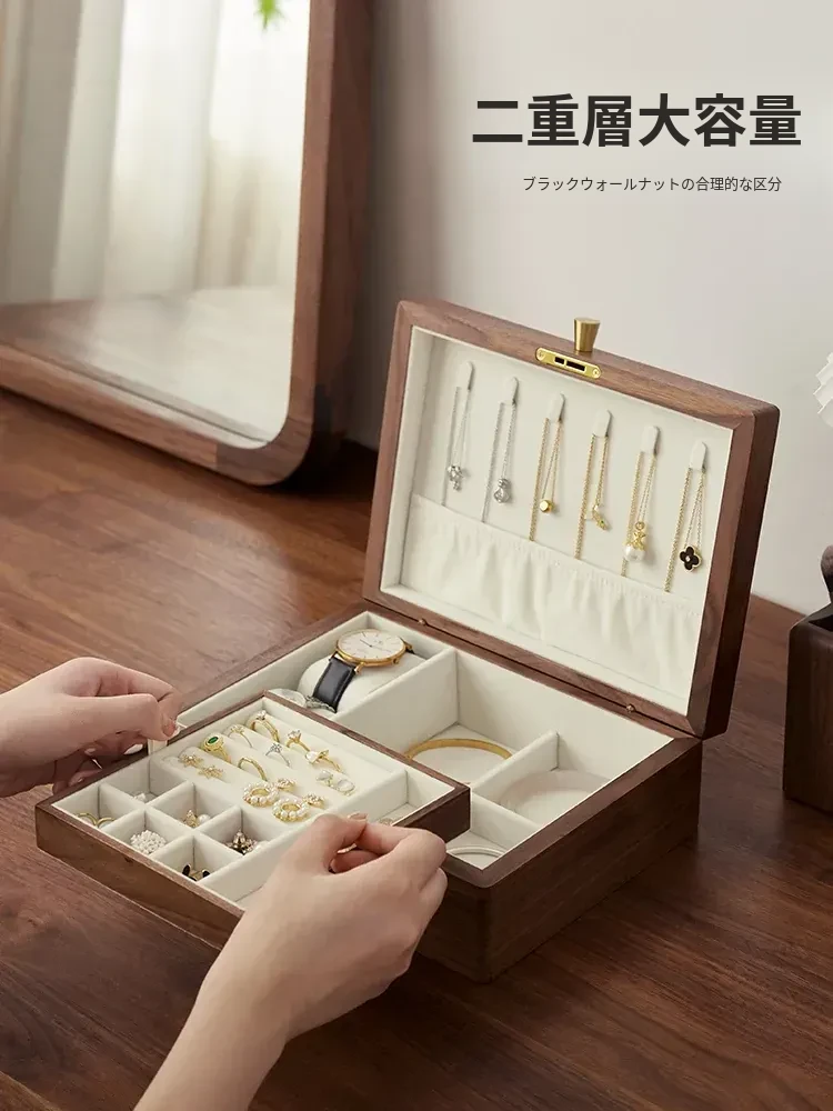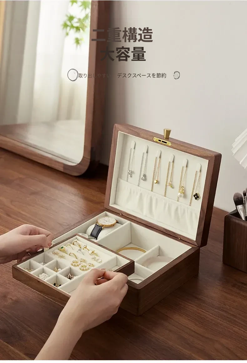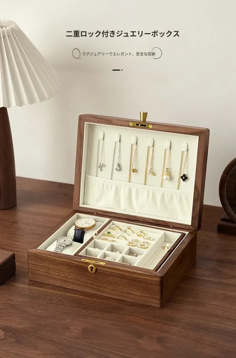 高級ブラックウォールナット製ジュエリーボックス - 精巧なデザインの二重収納ケースで、大切な指輪やイヤリングを美しく整理!あなたの宝物をスタイリッシュに守ります。