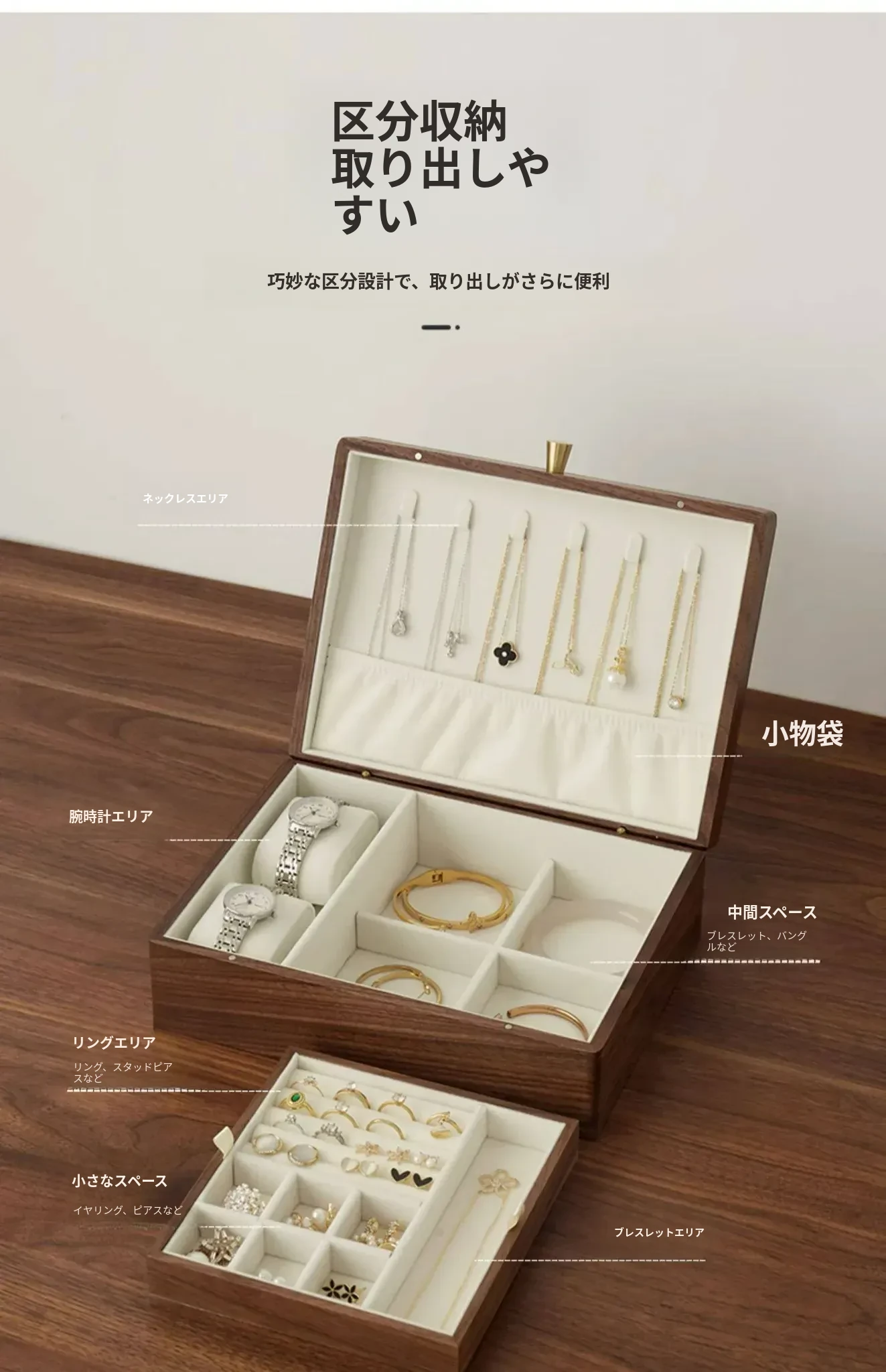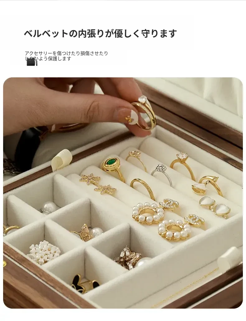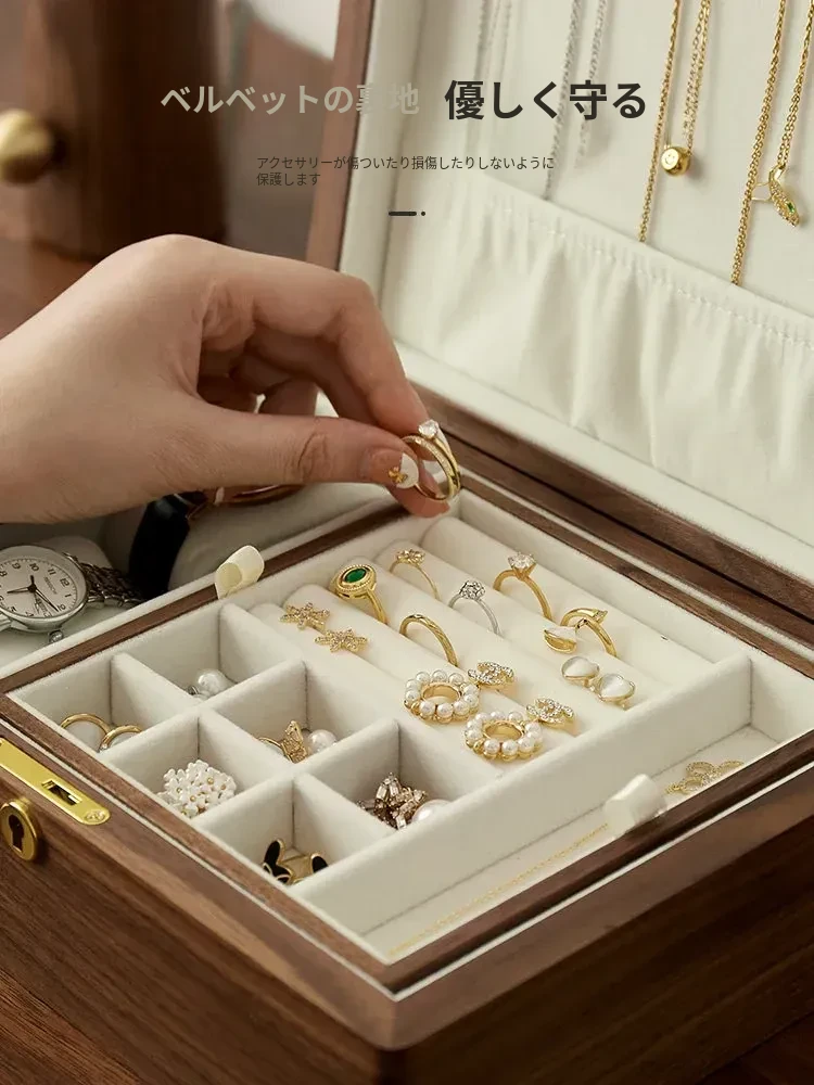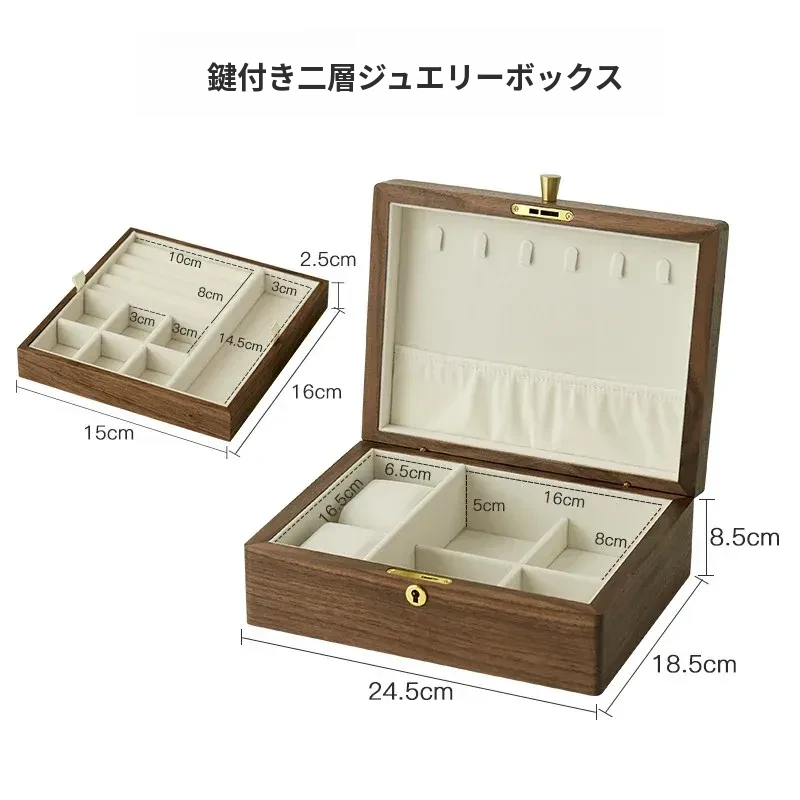 高級ブラックウォールナット製ジュエリーボックス - 精巧なデザインの二重収納ケースで、大切な指輪やイヤリングを美しく整理!あなたの宝物をスタイリッシュに守ります。