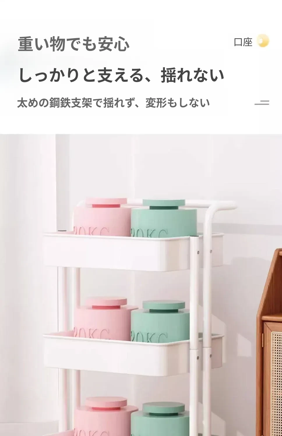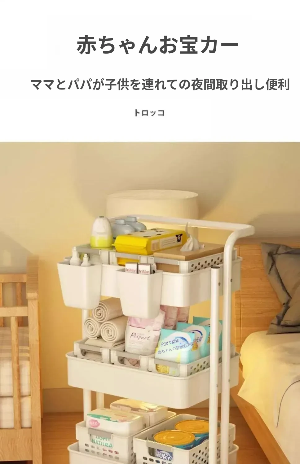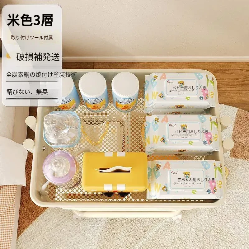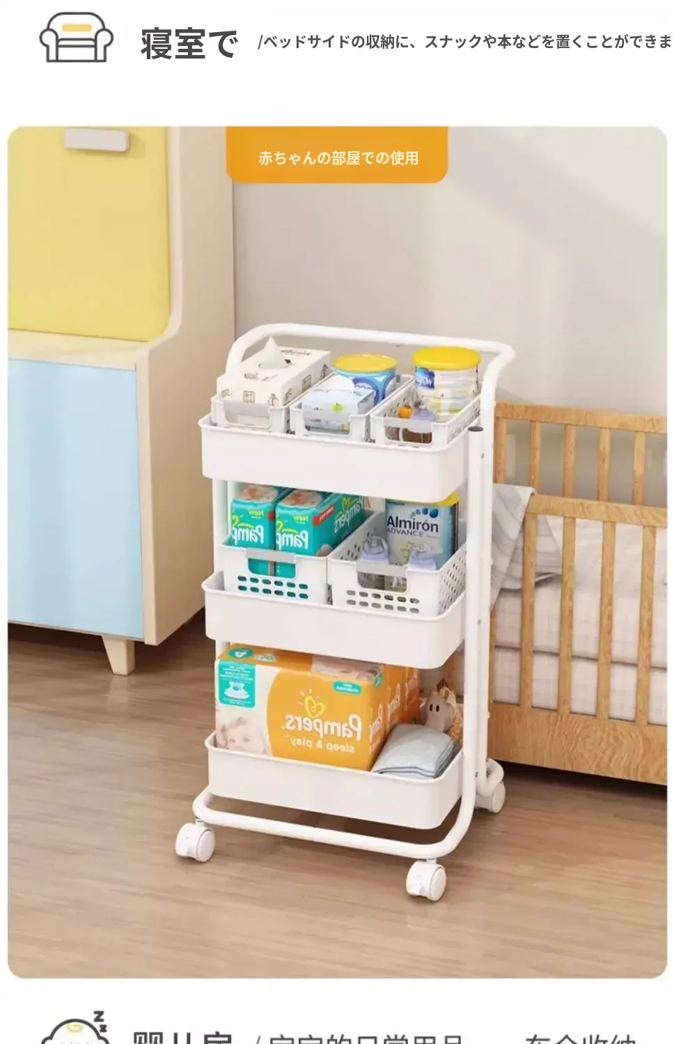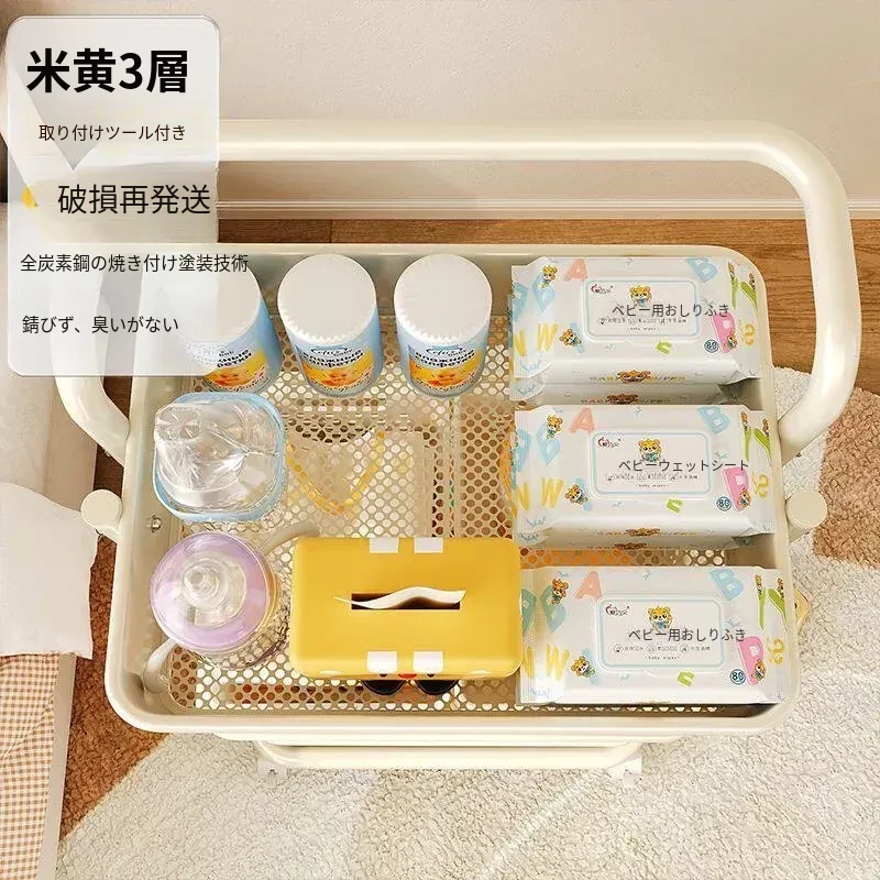 クリームイエロー有柵-底幅35cm 層距280mm-4底管4中杆3収納バスケット4キャスター