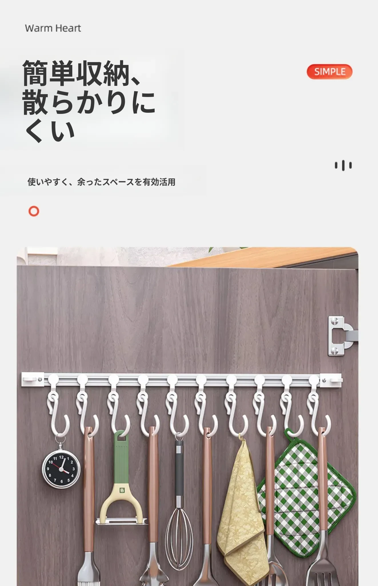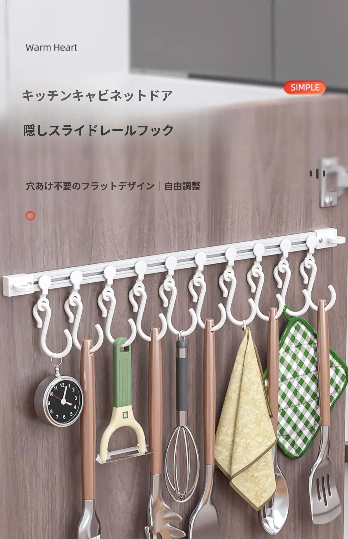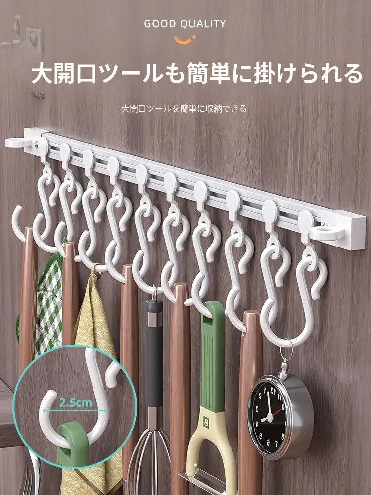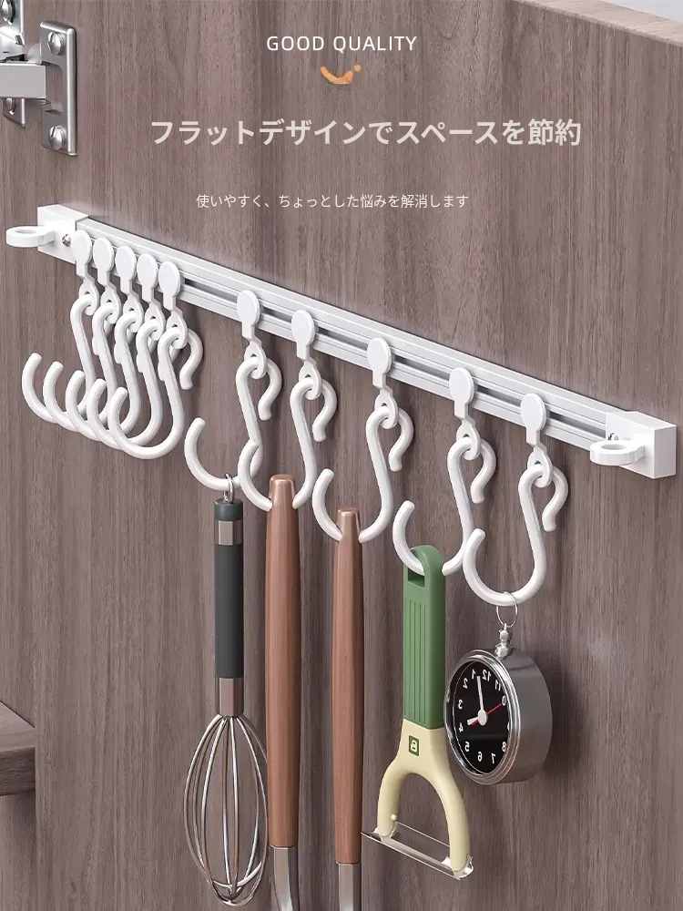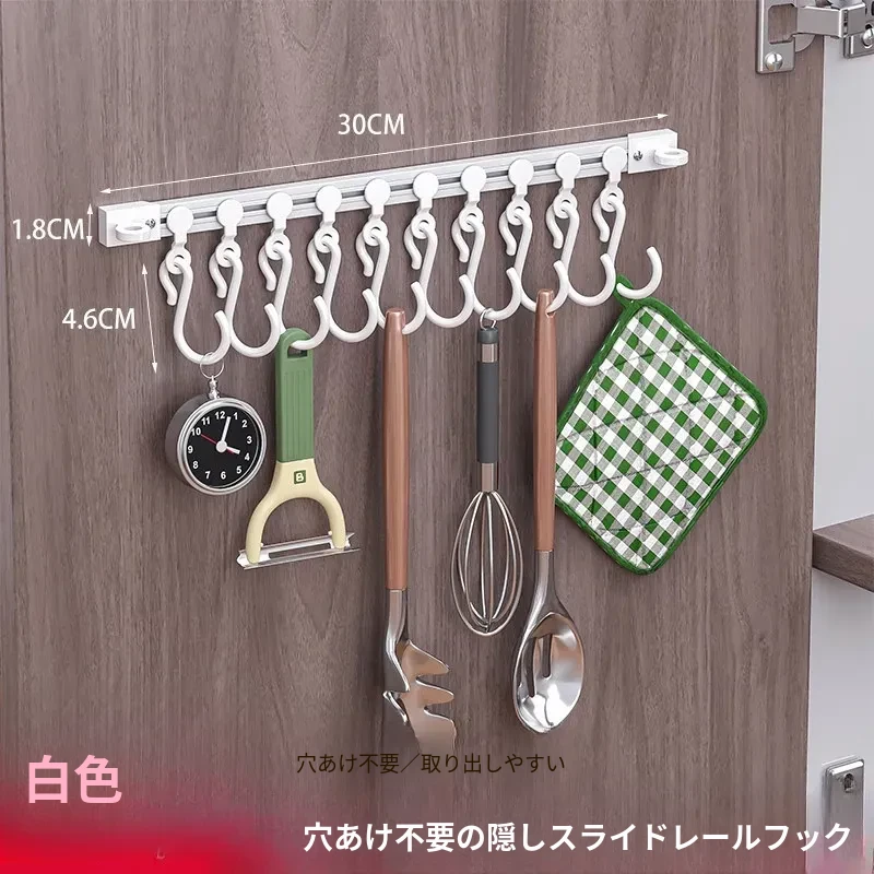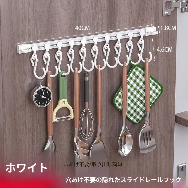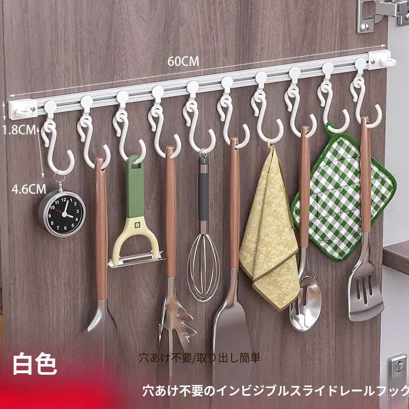 キッチンの収納革命!ドア裏に簡単取り付け、穴あけ不要のスライドトラックフック。便利なシリコン製スパチュラや調理器具をすっきり整理!キッチンをもっとスッキリ、使いやすく!