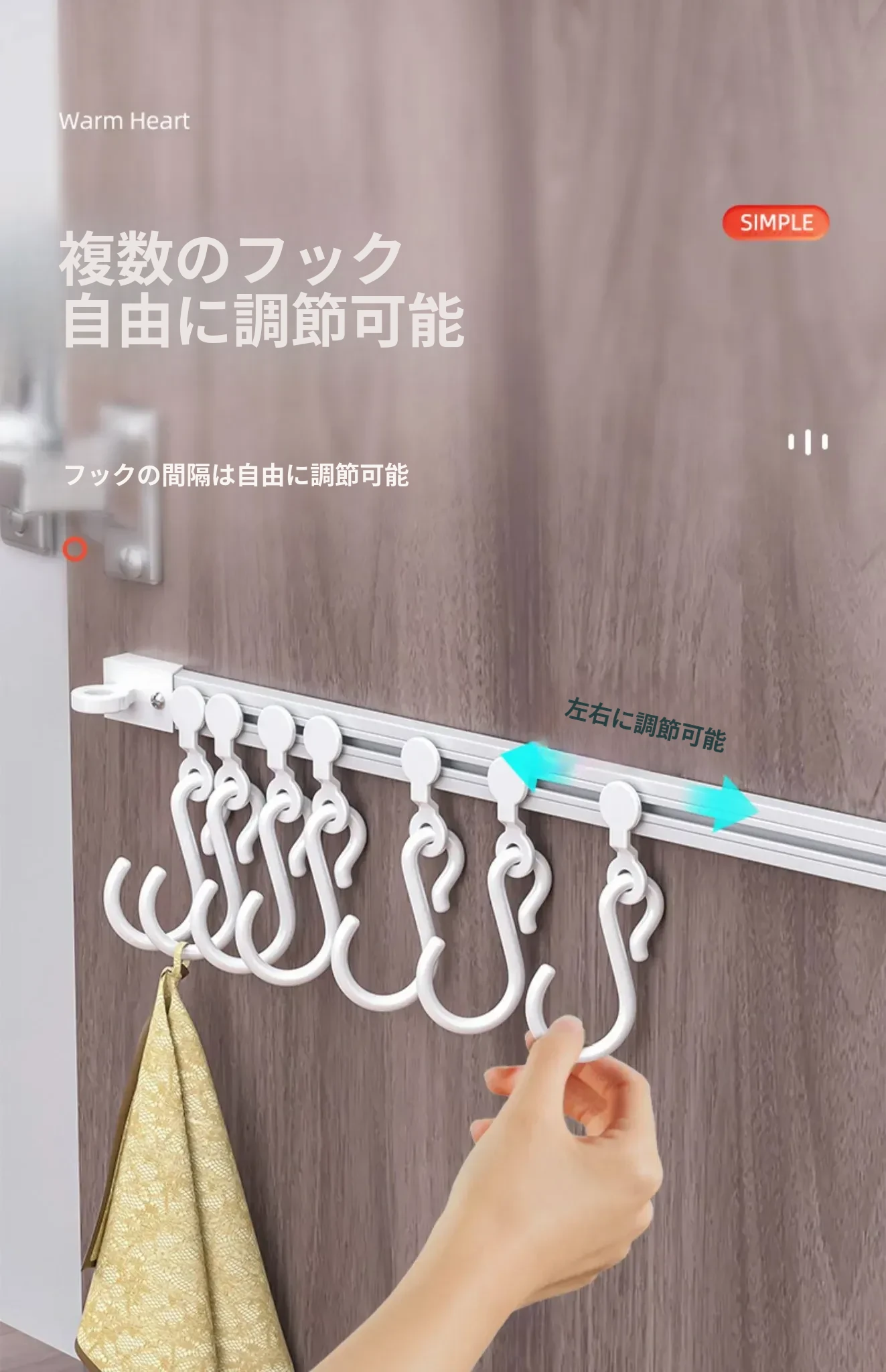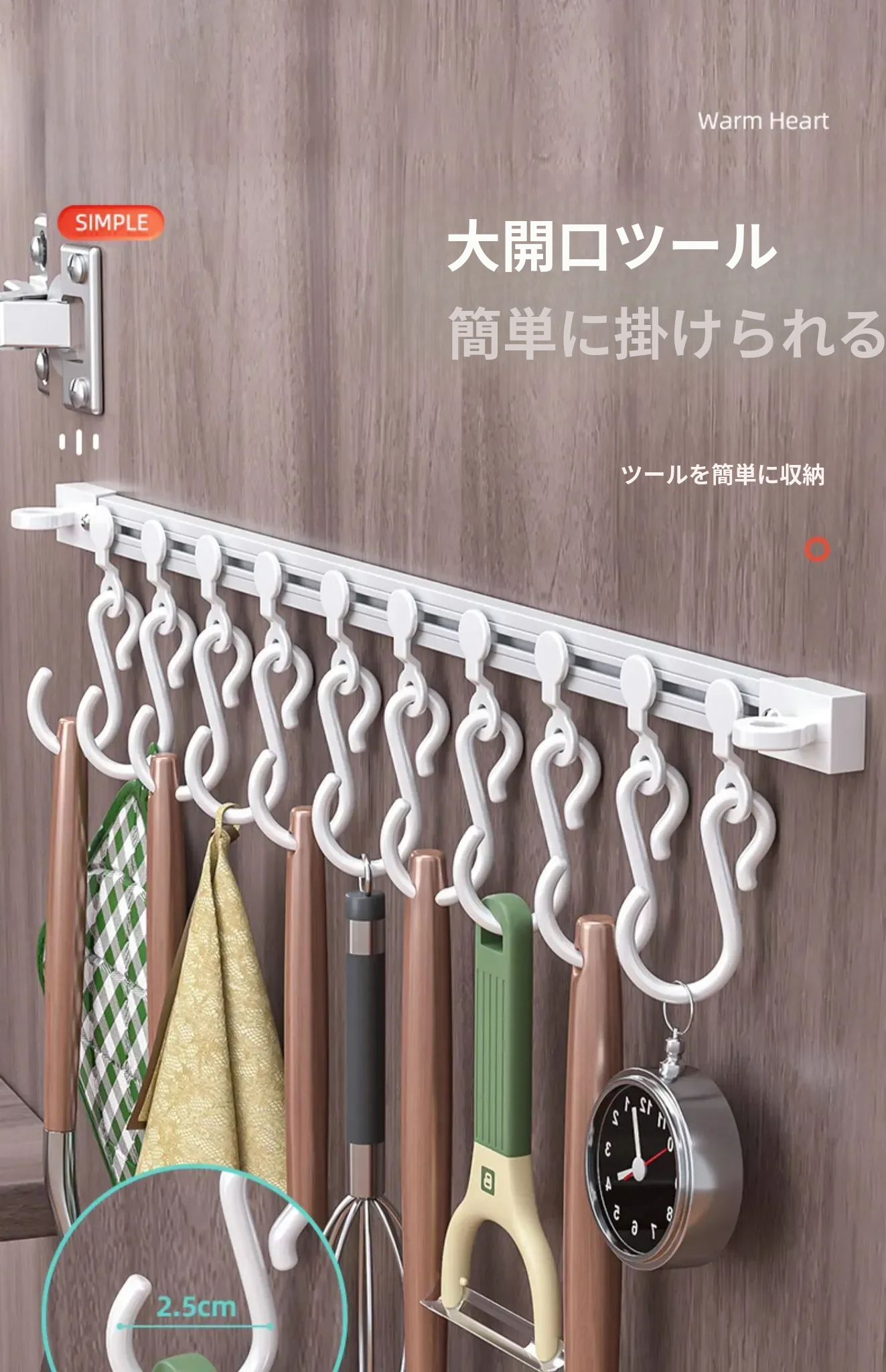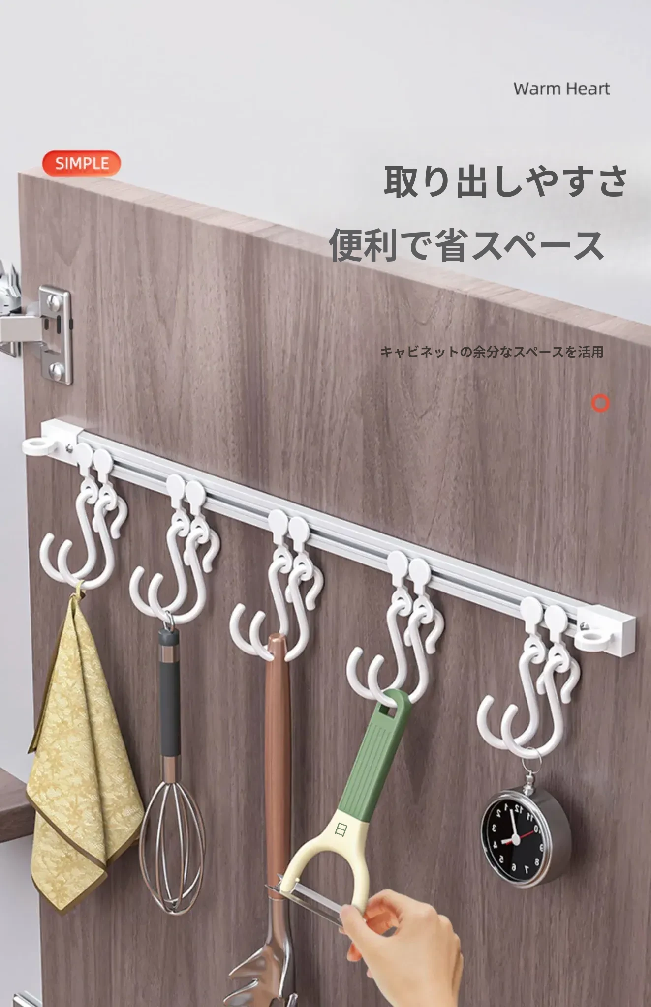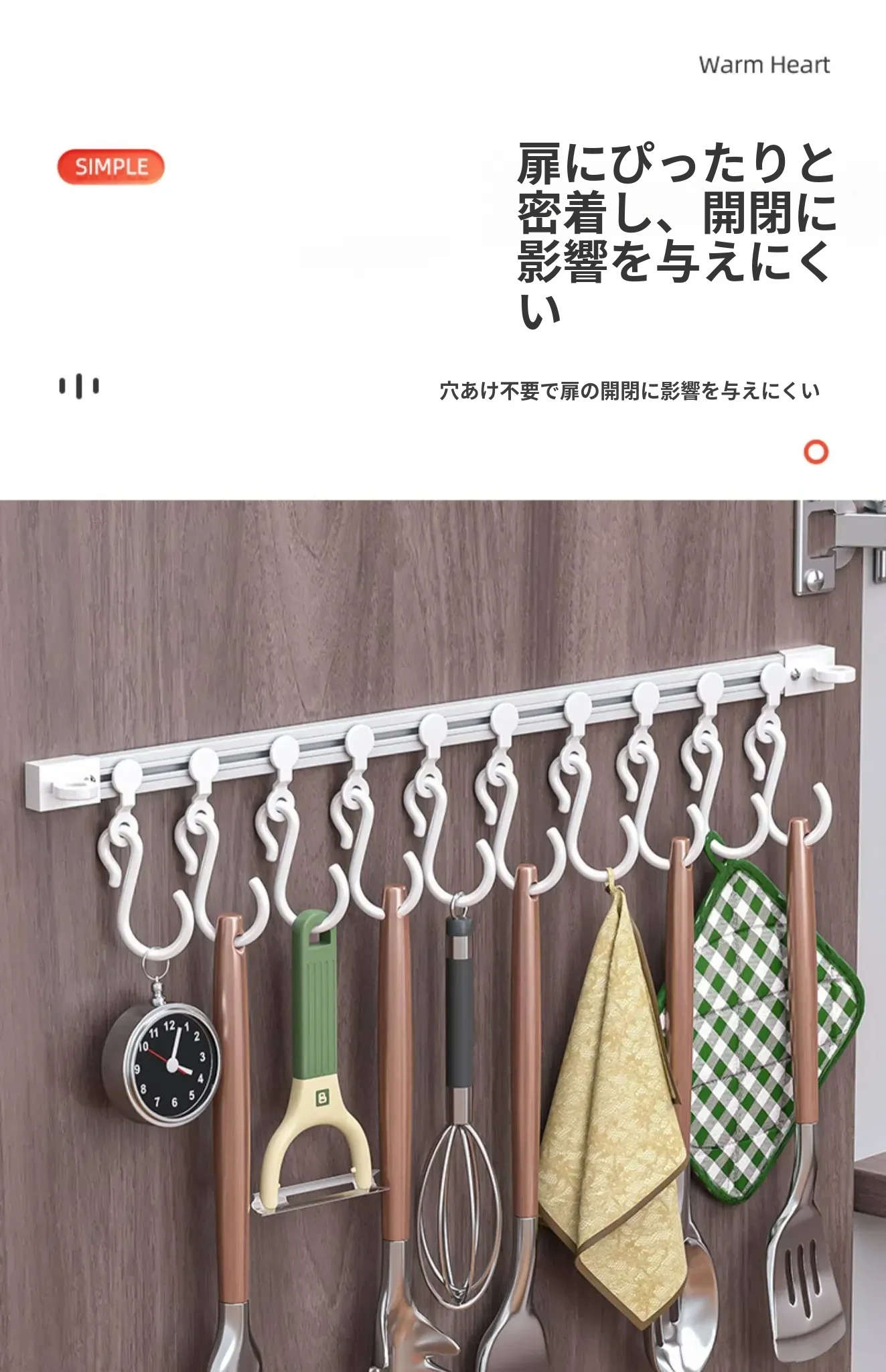 キッチンの収納革命!ドア裏に簡単取り付け、穴あけ不要のスライドトラックフック。便利なシリコン製スパチュラや調理器具をすっきり整理!キッチンをもっとスッキリ、使いやすく!