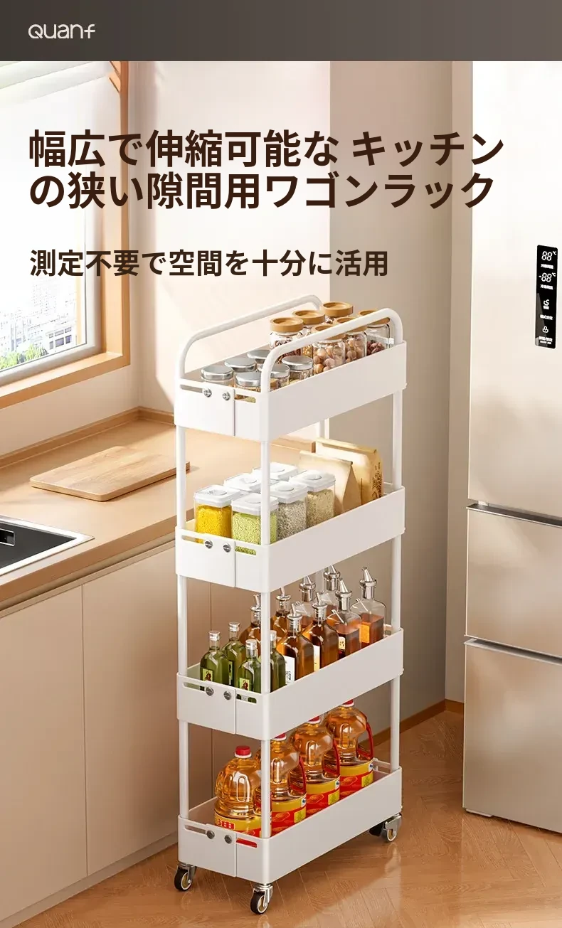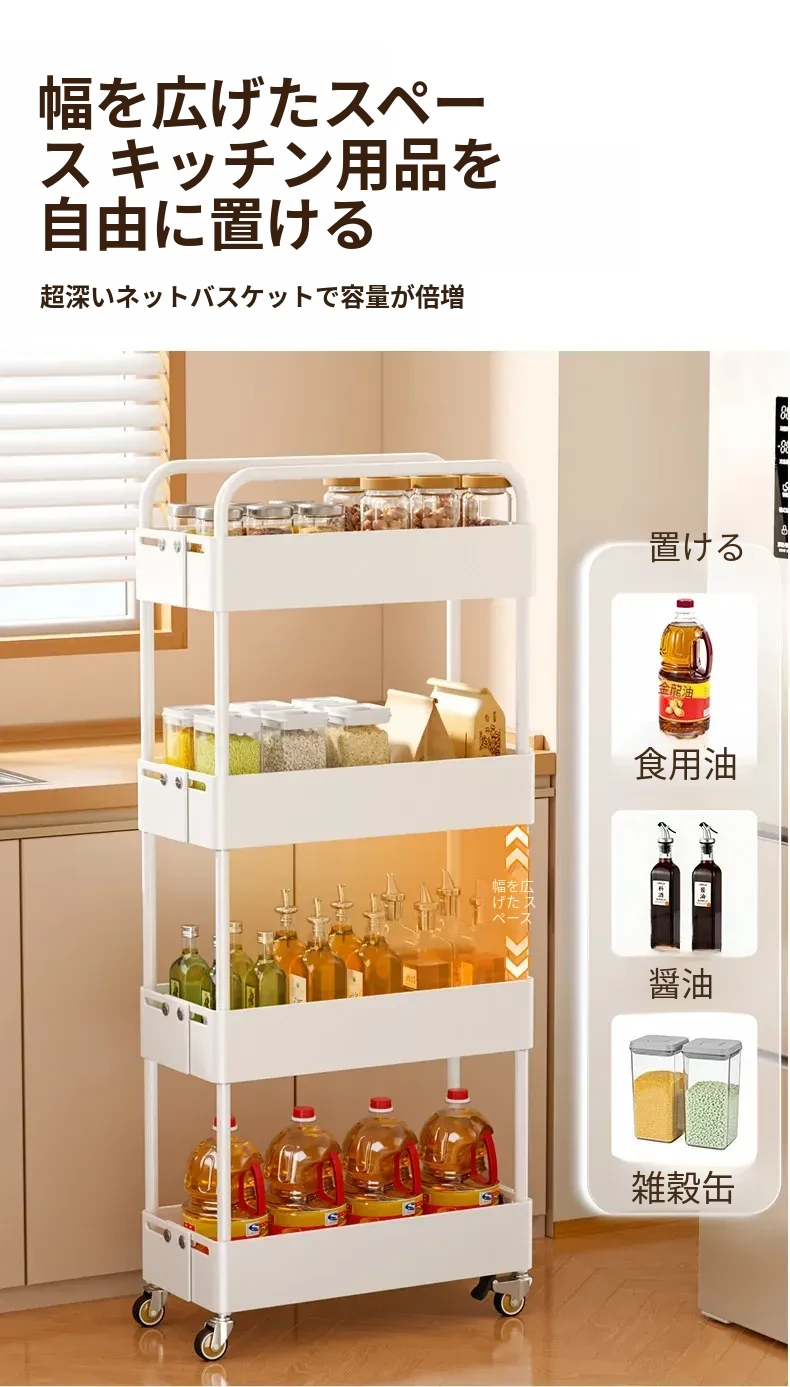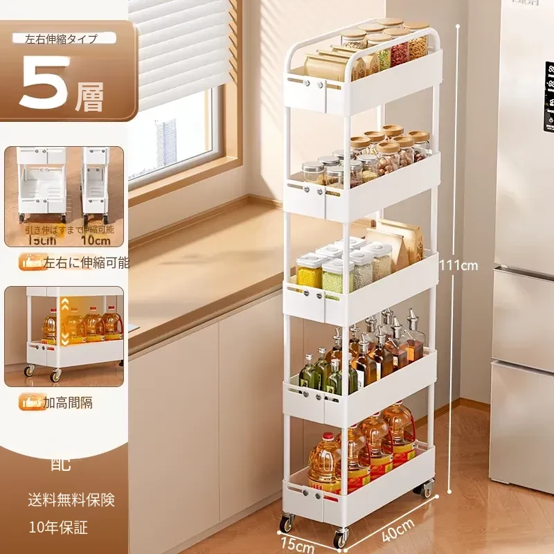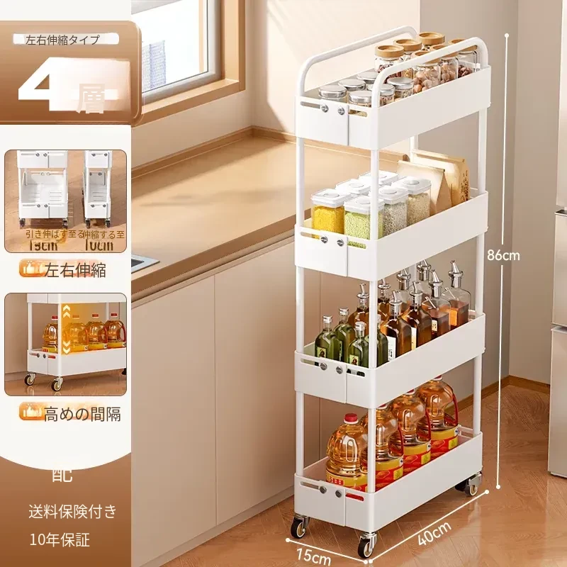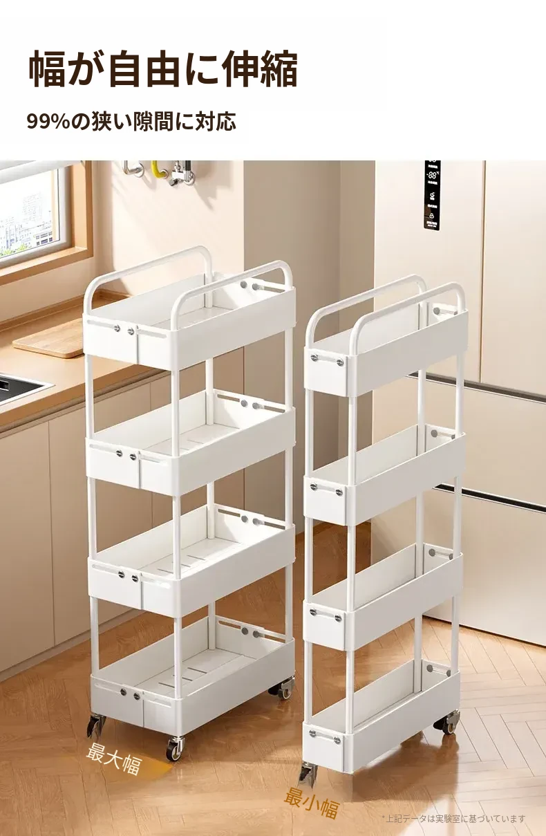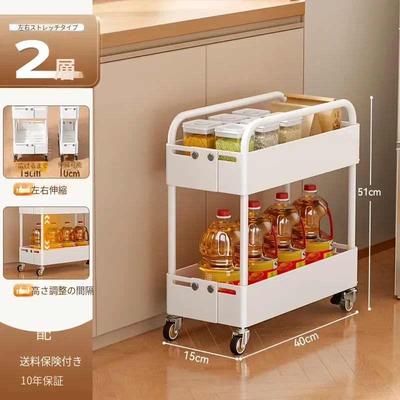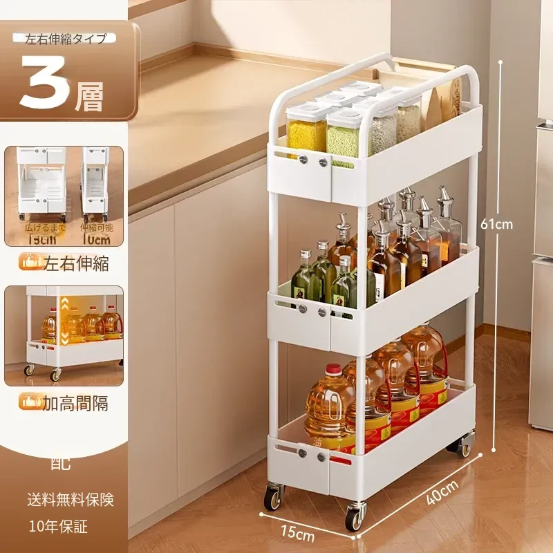 キッチン用伸縮式スリムキャリー!冷蔵庫の隙間やバルコニーにぴったりの15cm幅収納ラック。スペースを有効活用し、おしゃれに整理整頓!
