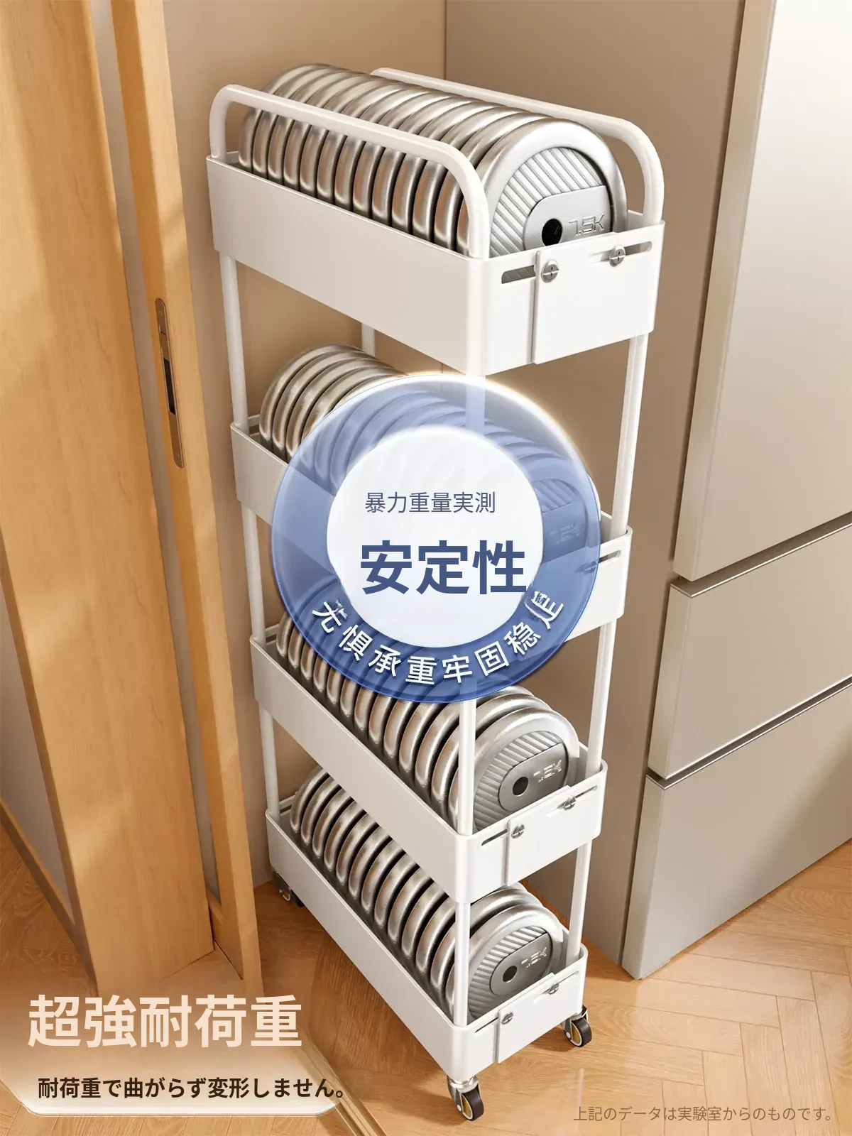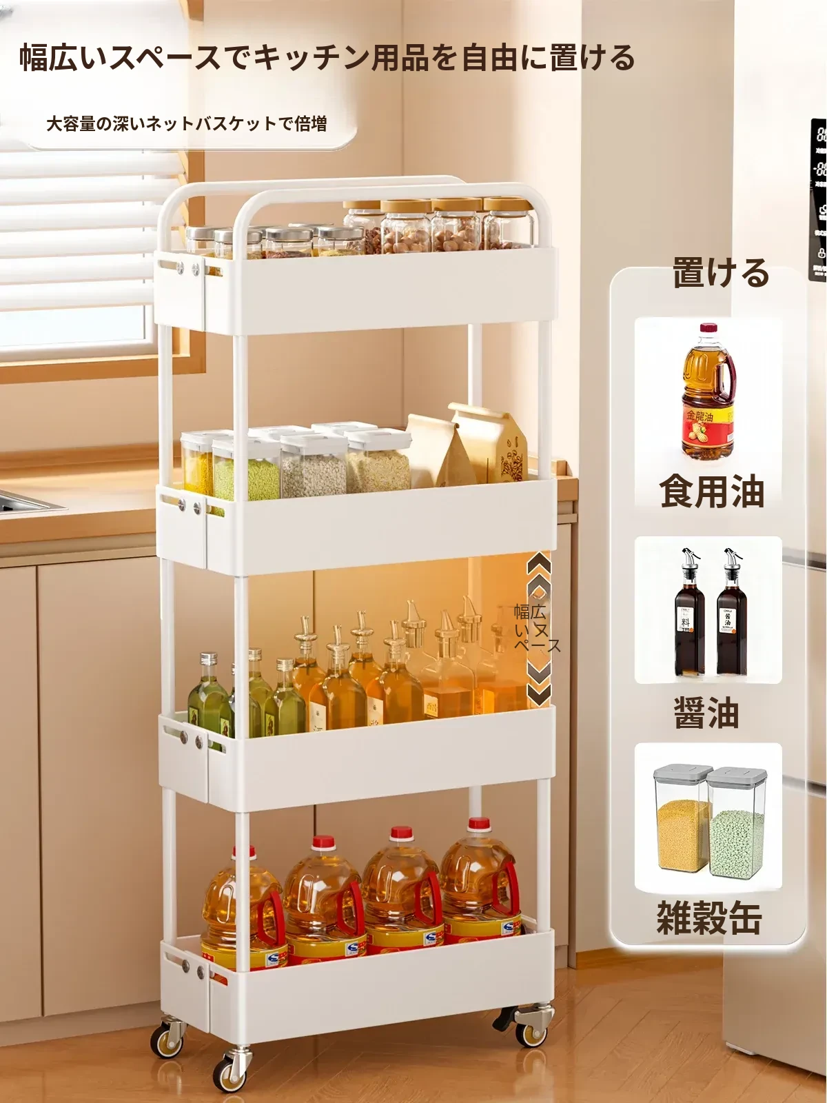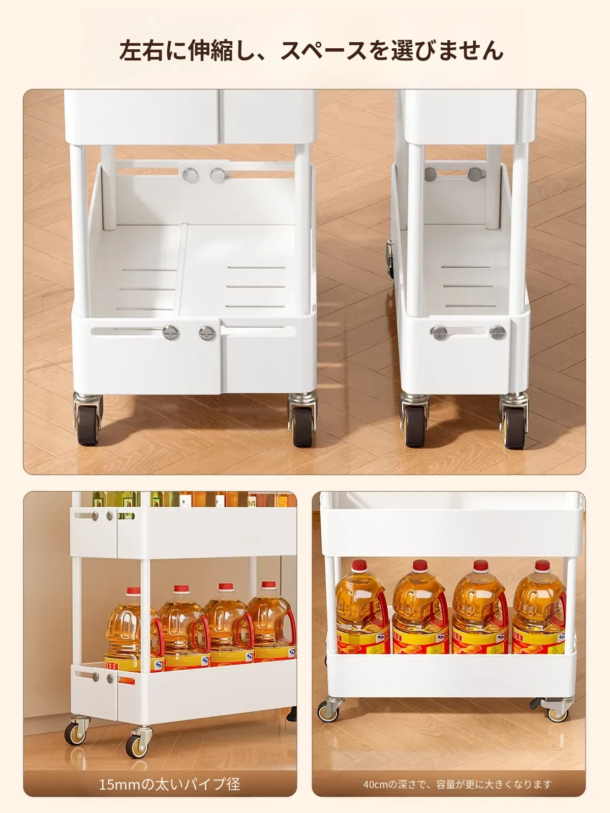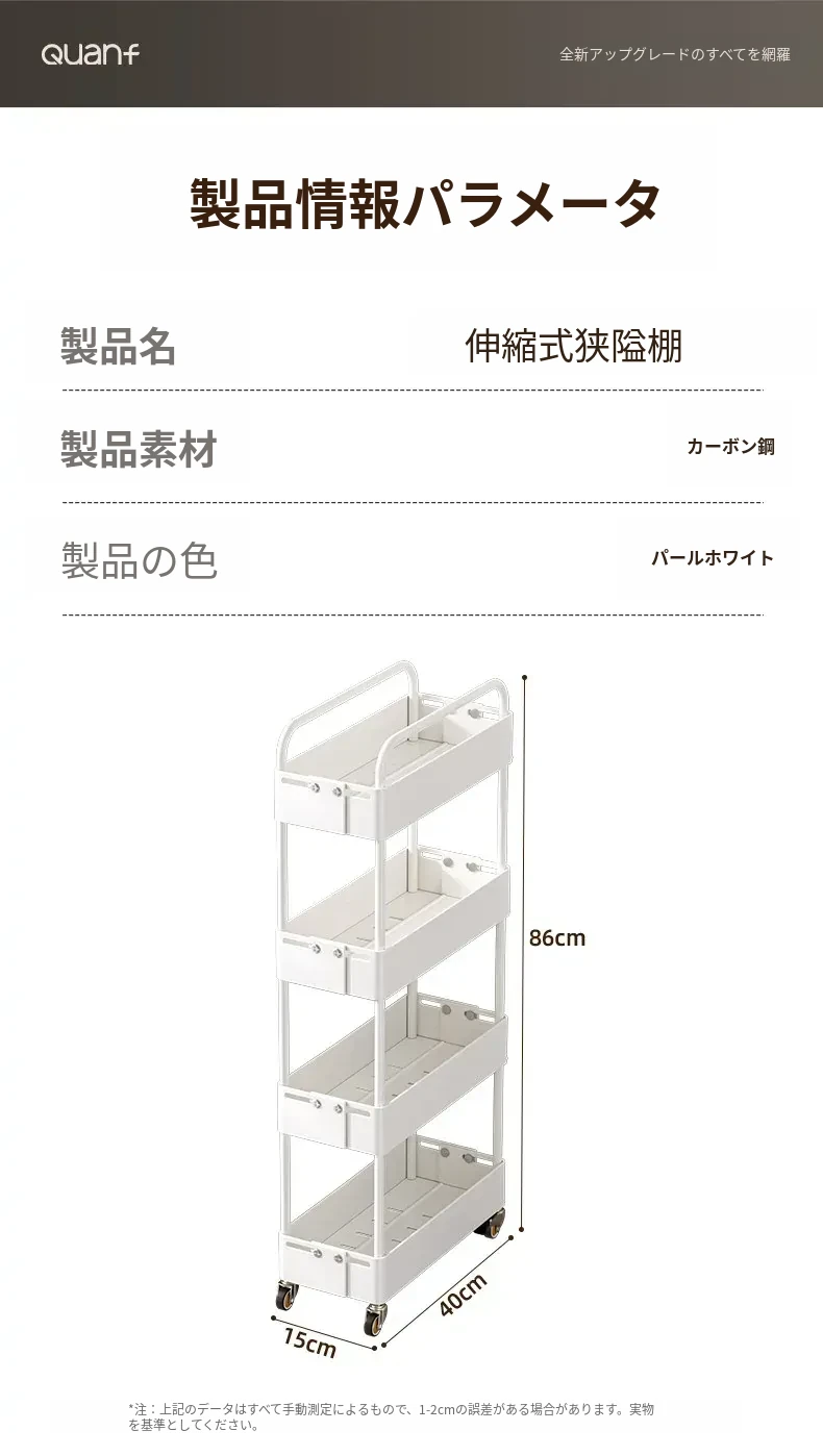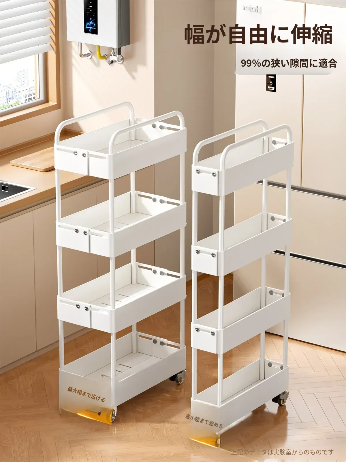 キッチン用伸縮式スリムキャリー!冷蔵庫の隙間やバルコニーにぴったりの15cm幅収納ラック。スペースを有効活用し、おしゃれに整理整頓!